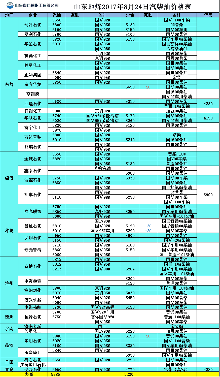 山東地?zé)?017年8月24日汽柴油價(jià)格表
