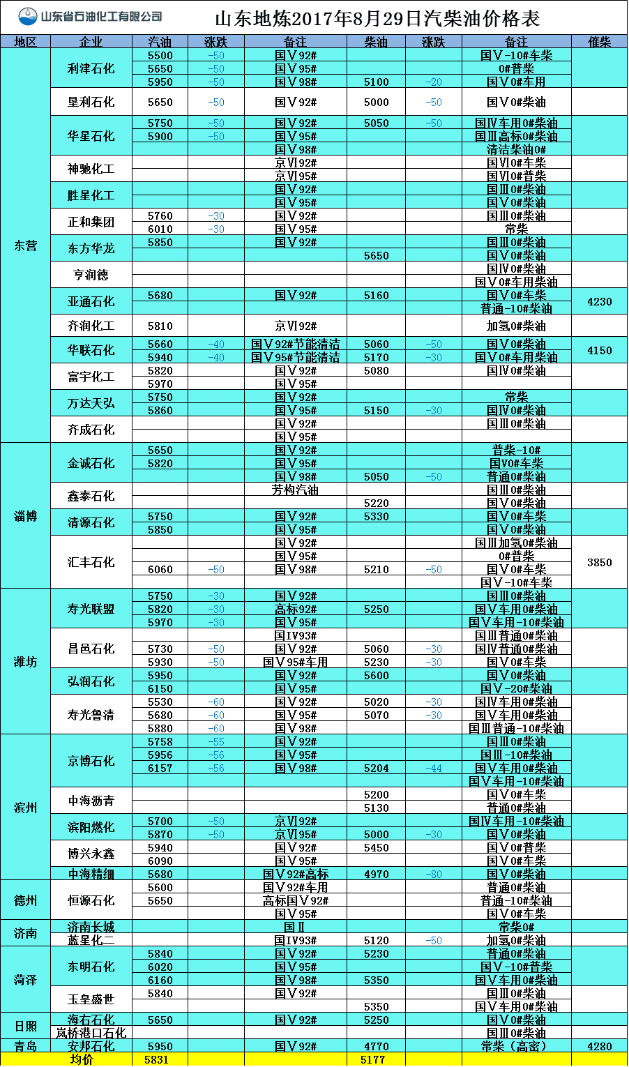 山東地煉2017年8月29日汽柴油價格表