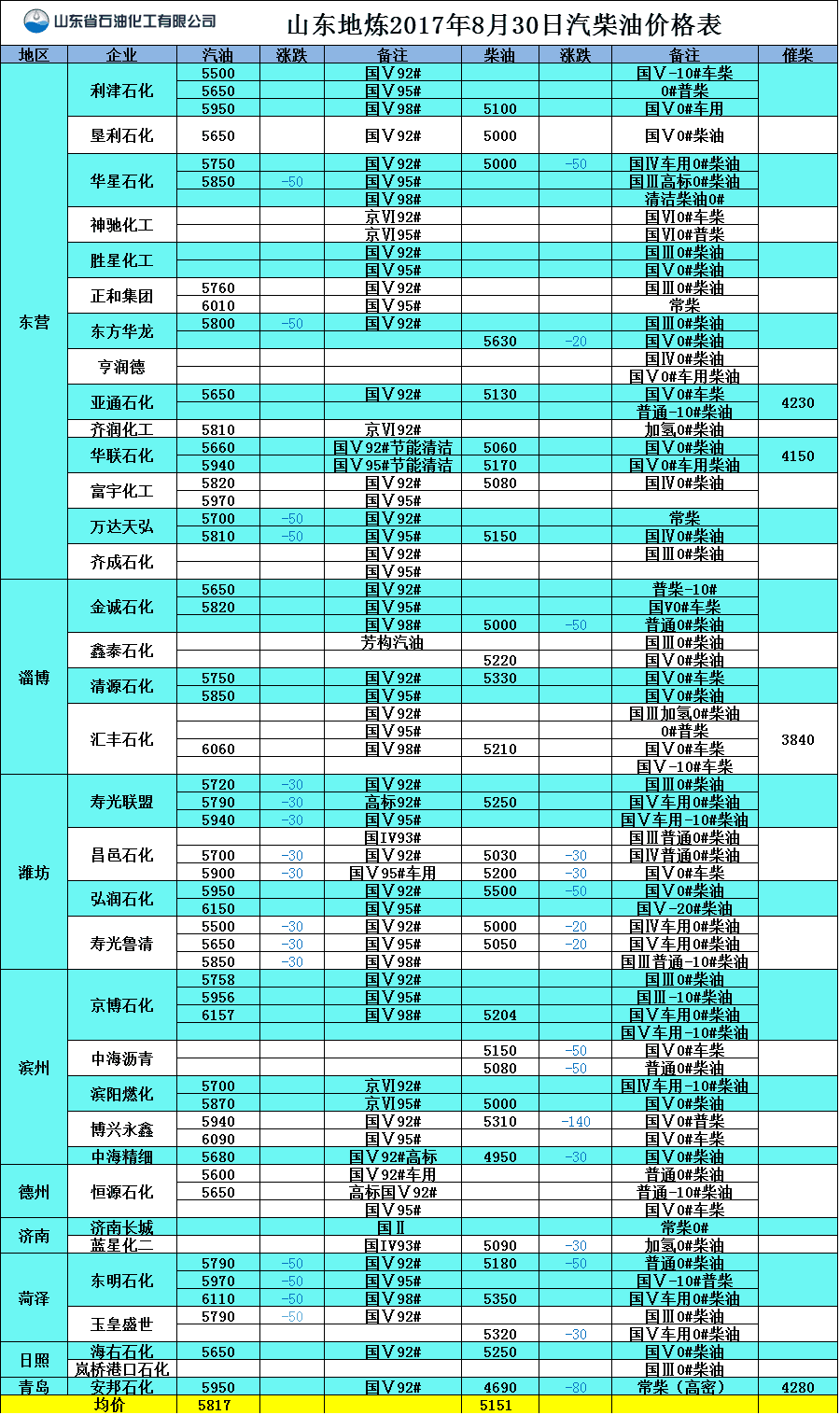 山東地?zé)?017年8月30日汽柴油價(jià)格表