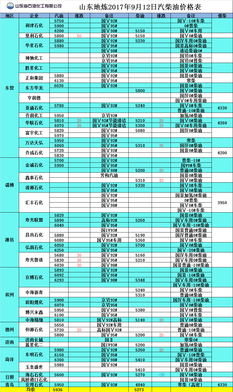 山東地?zé)?017年9月12日汽柴油價(jià)格表