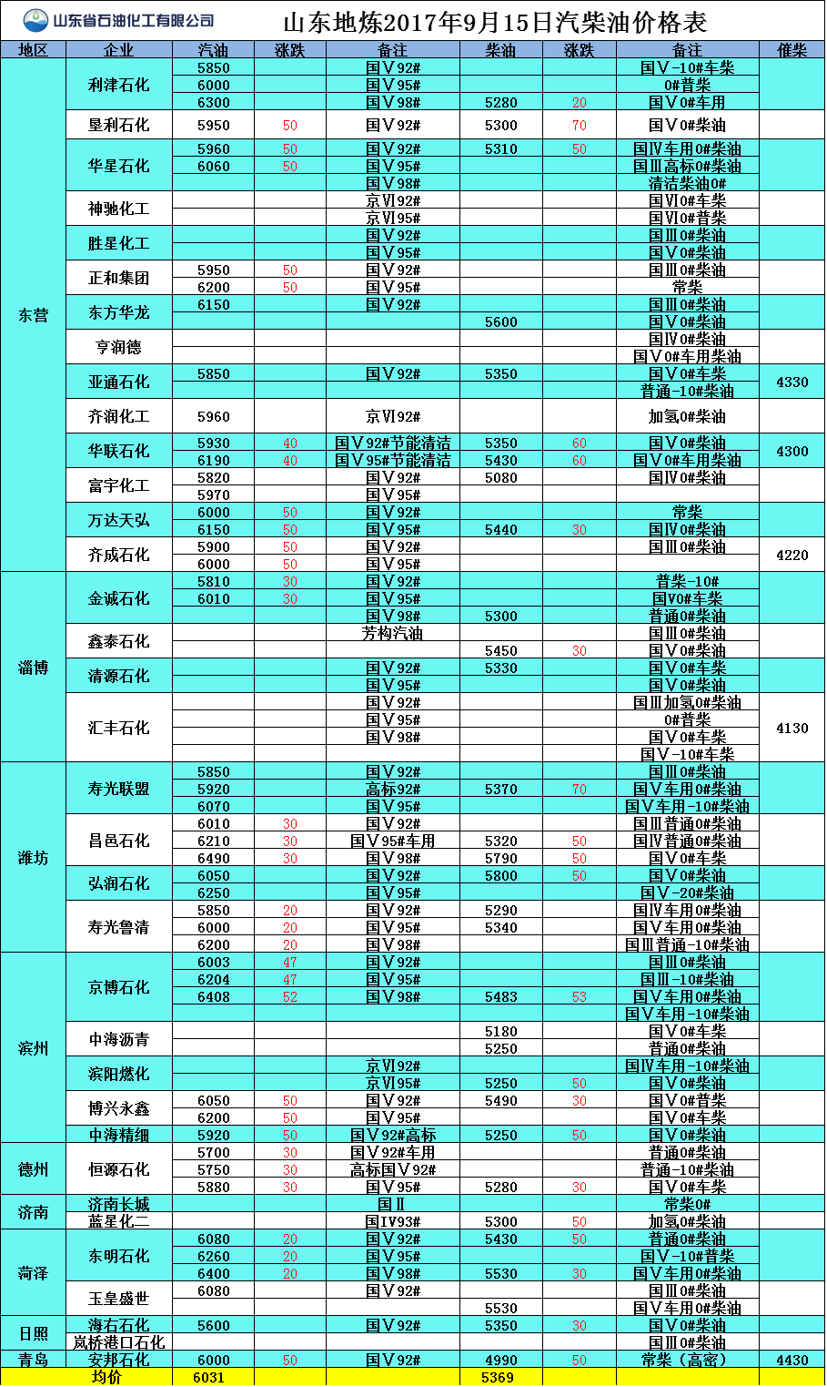 山東地煉2017年9月15日汽柴油價格表