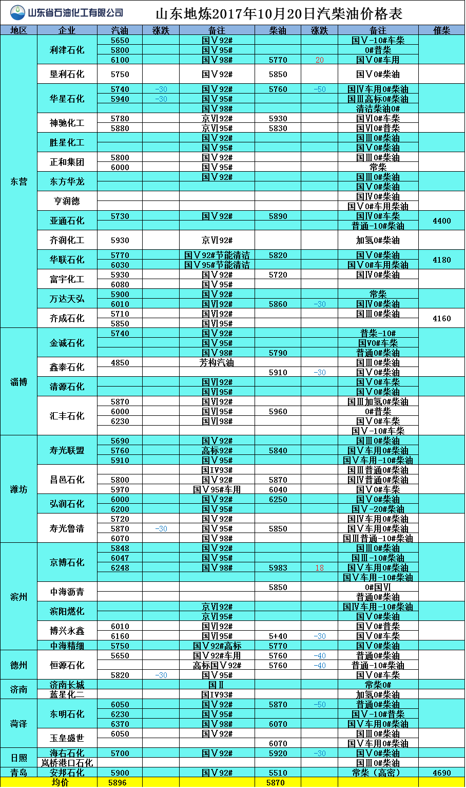 山東地煉2017年10月20日汽柴油價格表