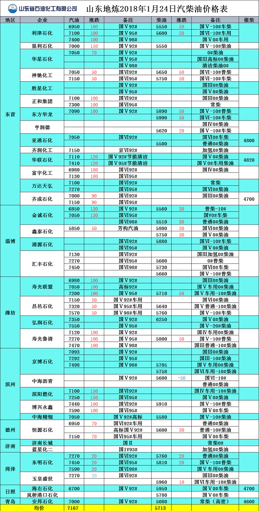 山東地煉2017年1月24日汽柴油價格表