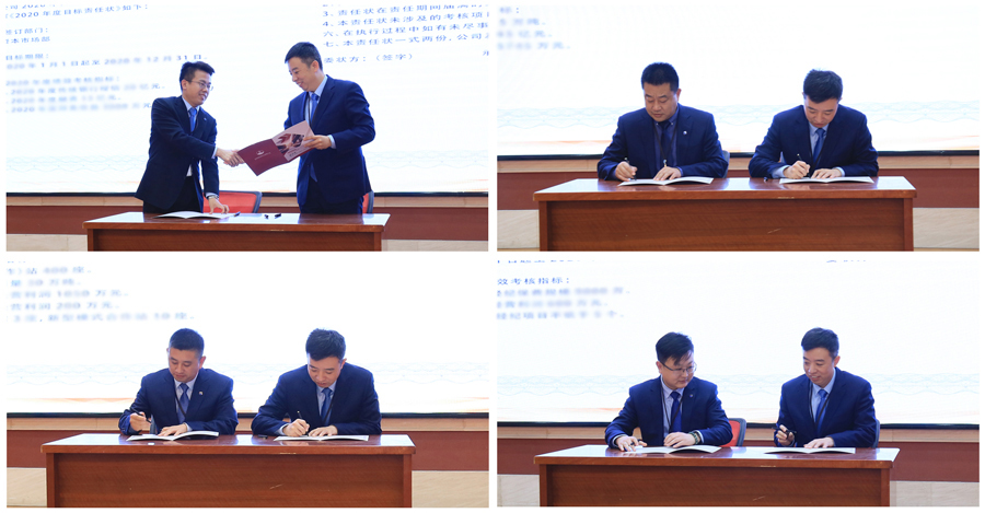 為了確保完成全年工作目標,統(tǒng)一思想認識,理清工作思路,明確責(zé)任目標,財務(wù)風(fēng)控部總監(jiān)李作江、能化產(chǎn)品經(jīng)營部負責(zé)人李建強、加盟合作事業(yè)部總經(jīng)理趙振峰、融泰保險經(jīng)紀總經(jīng)理劉龍分別與山東石化董事長兼總經(jīng)理祝偉簽訂2020年責(zé)任狀。
