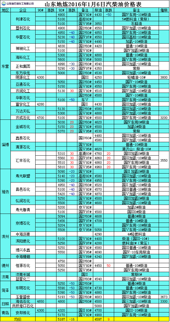 2016年1月6日山東地?zé)捚裼蛢r(jià)格表