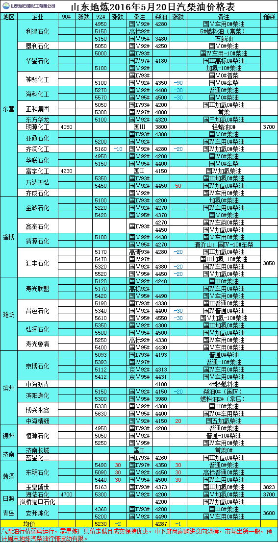 2016年5月20日山東地煉汽柴油價格表