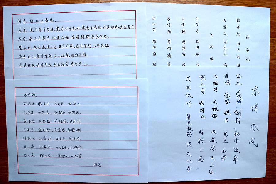 本屆書法比賽初賽采取個(gè)人提交以國學(xué)內(nèi)容為書寫主題的硬筆書法作品的形式,在提交的23幅初賽作品中,既有《論語》、《弟子規(guī)》名句,也有道家、孝經(jīng)名段,參賽作品或?yàn)t灑,或清秀,或剛健,或大氣,各具特色,展示了公司家人們的書寫底蘊(yùn)和審美情趣。在初賽中,通過微信網(wǎng)絡(luò)投票的方式,選取票數(shù)最多的前十名家人進(jìn)入決賽。