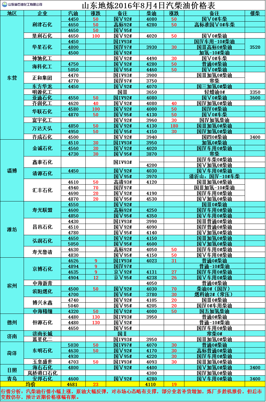行情分析:汽柴油行情小幅上漲,原油大幅反彈,對市場心態(tài)略有支撐,部分業(yè)者補貨增加,煉廠多趁機推價,但后市變數(shù)仍存,預計近期價格漲幅有限。
