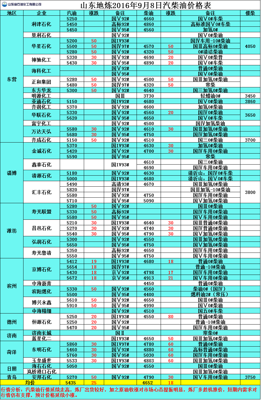 行情分析:汽柴油行情延續(xù)走高,煉廠出貨較好,加之原油收漲對(duì)市場(chǎng)心態(tài)提振明顯,煉廠多趁機(jī)推價(jià),短期內(nèi)需求對(duì)行情仍有支撐,預(yù)計(jì)價(jià)格延續(xù)小漲。
