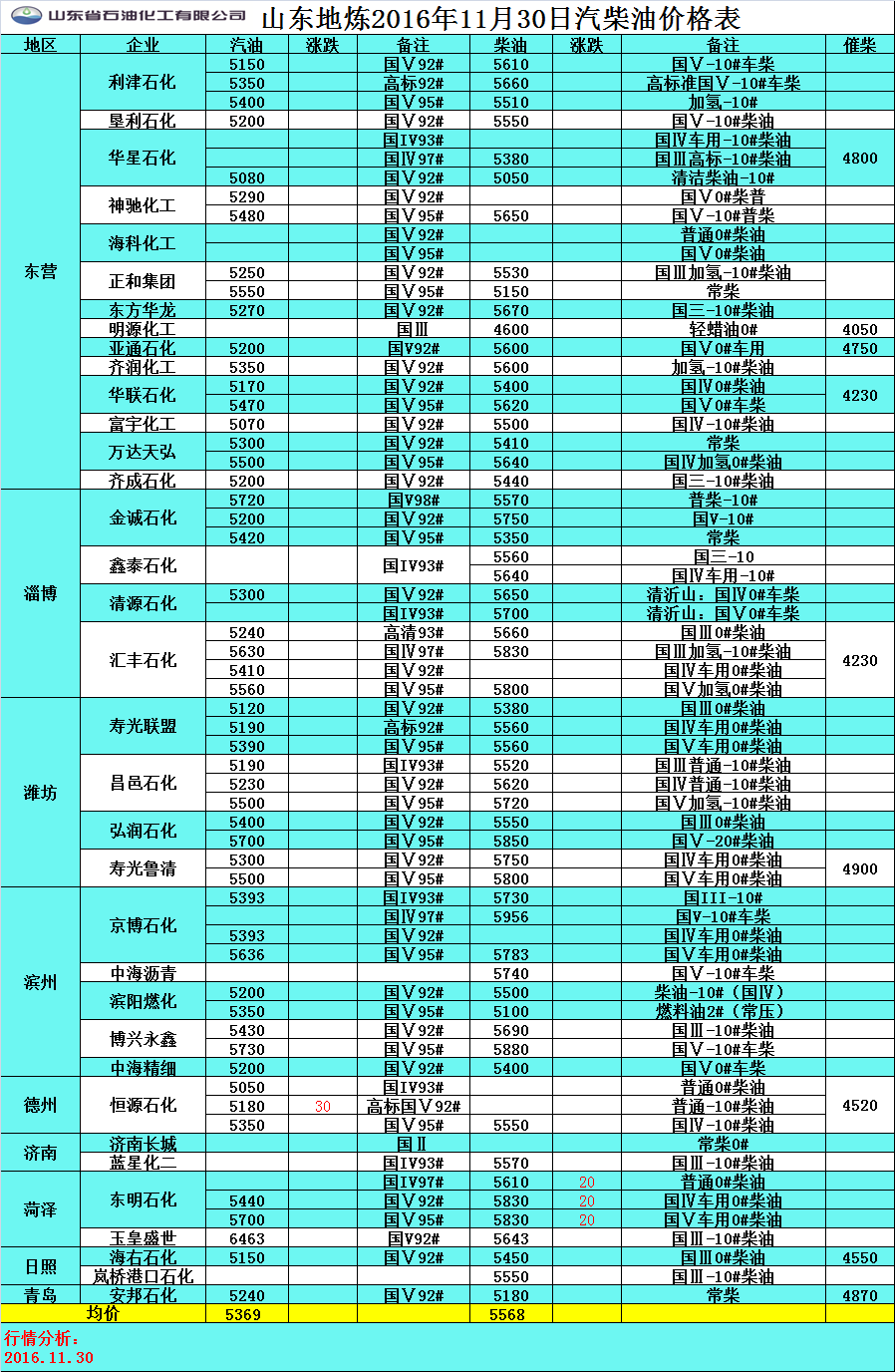 11月30日山東地煉汽柴油價格