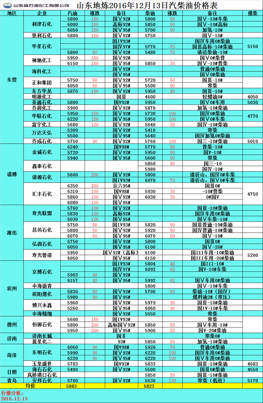 12月13日山東地煉汽柴油價格