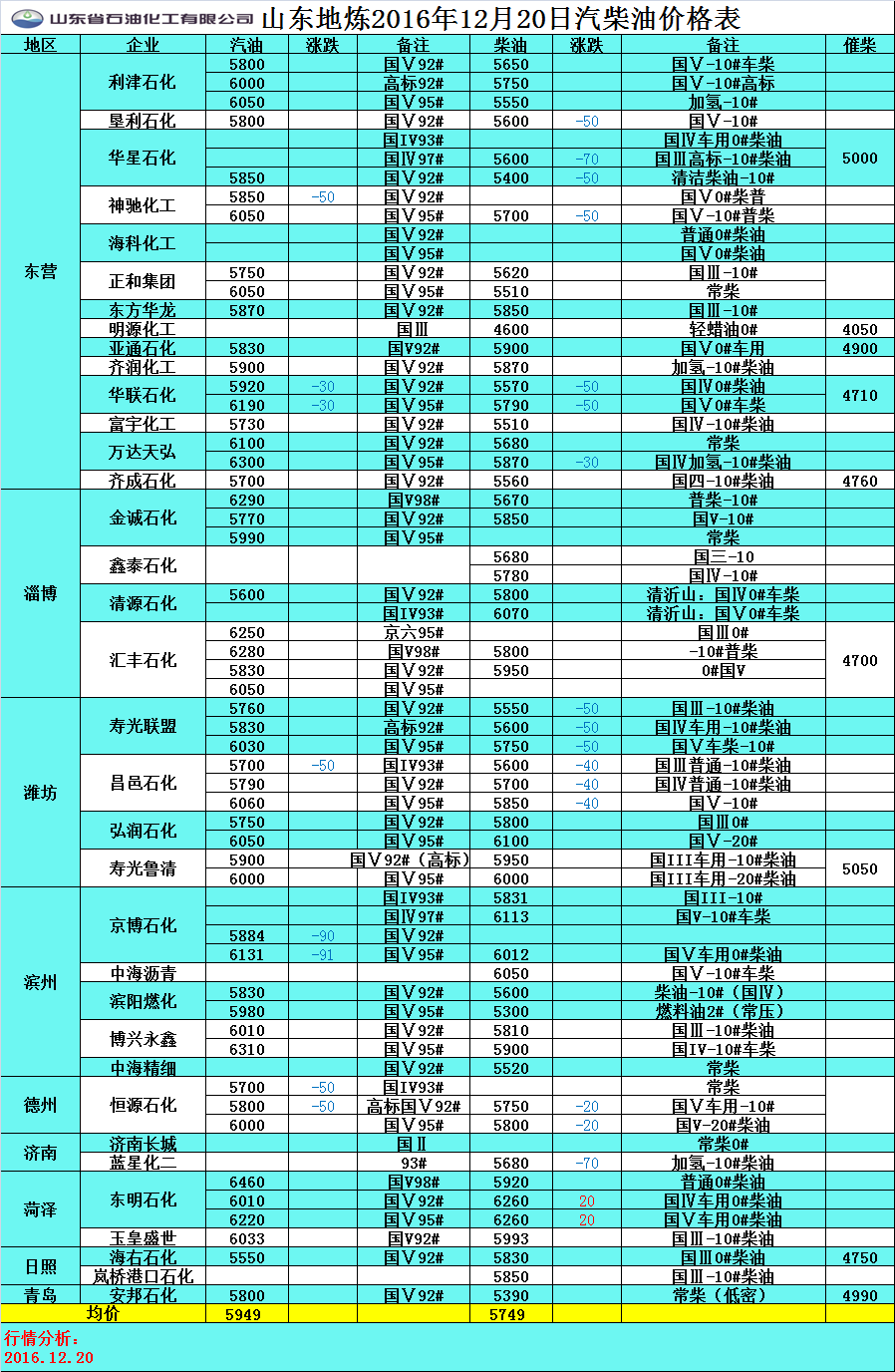 12月20日山東地煉汽柴油價格