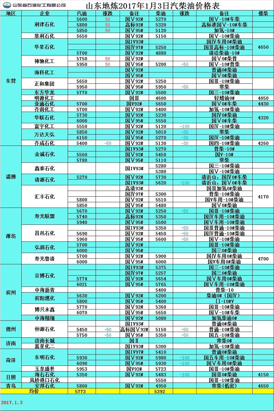 2017年1月4日山東地煉汽柴油價格