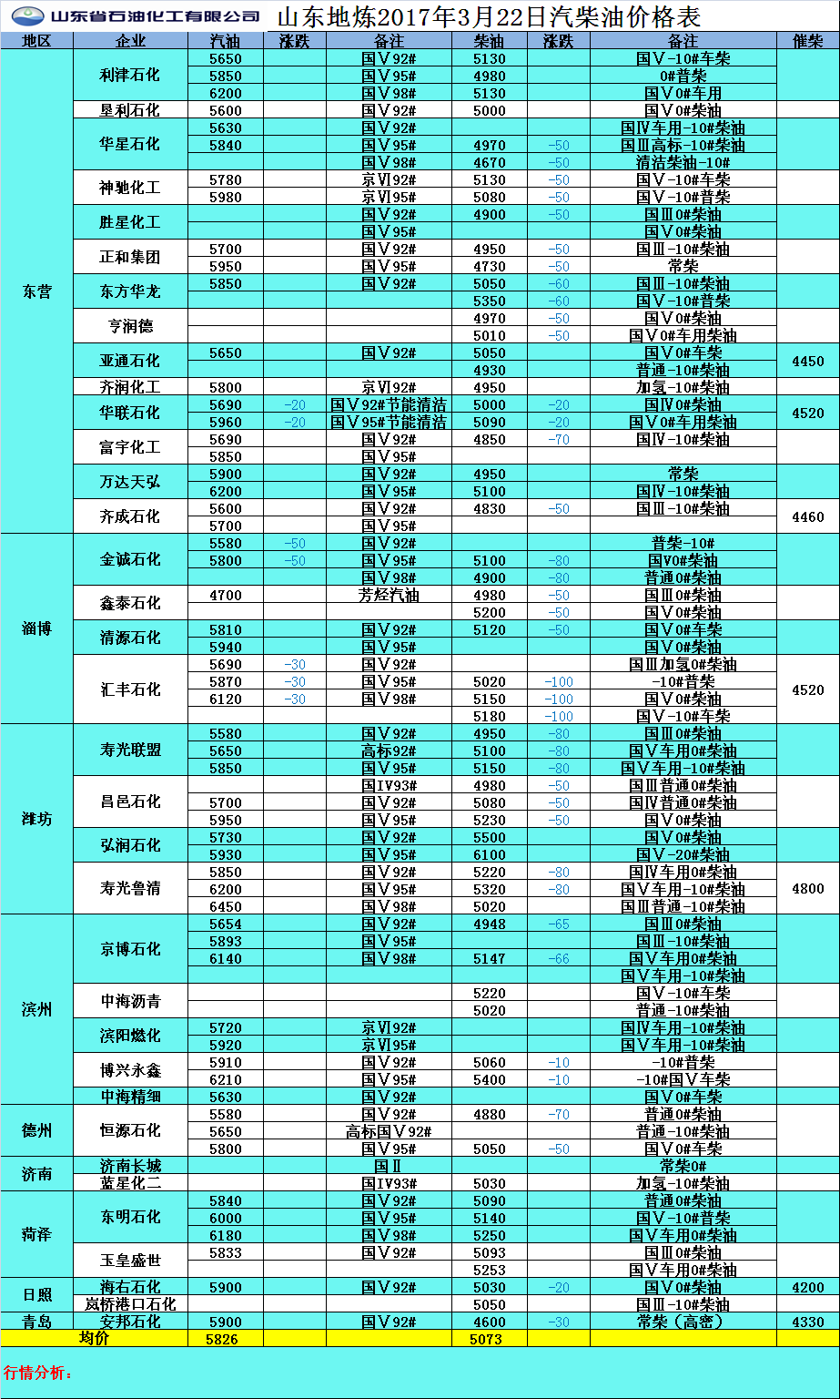 2017年3月22日山東地煉汽柴油價格