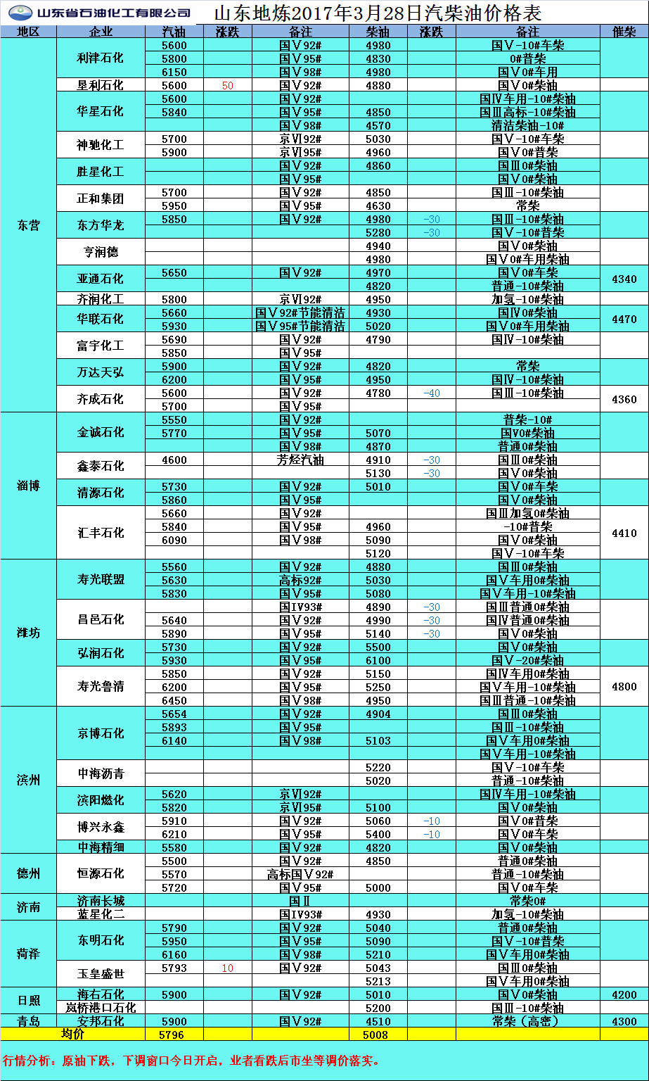 2017年3月28日山東地煉汽柴油價格