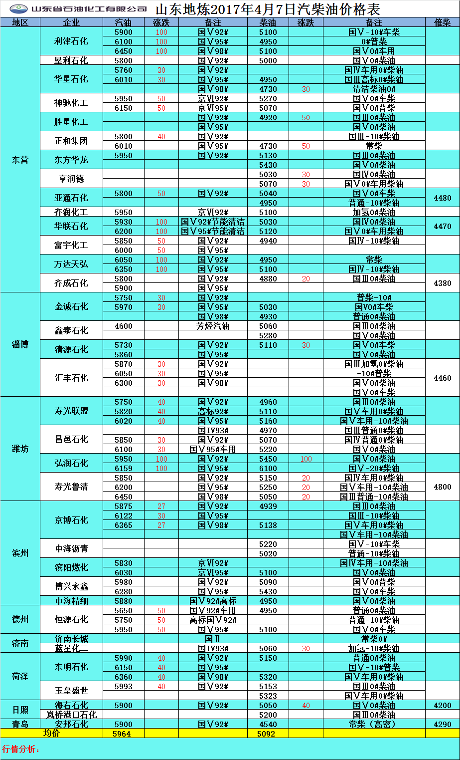 2017年4月7日山東地煉汽柴油價格