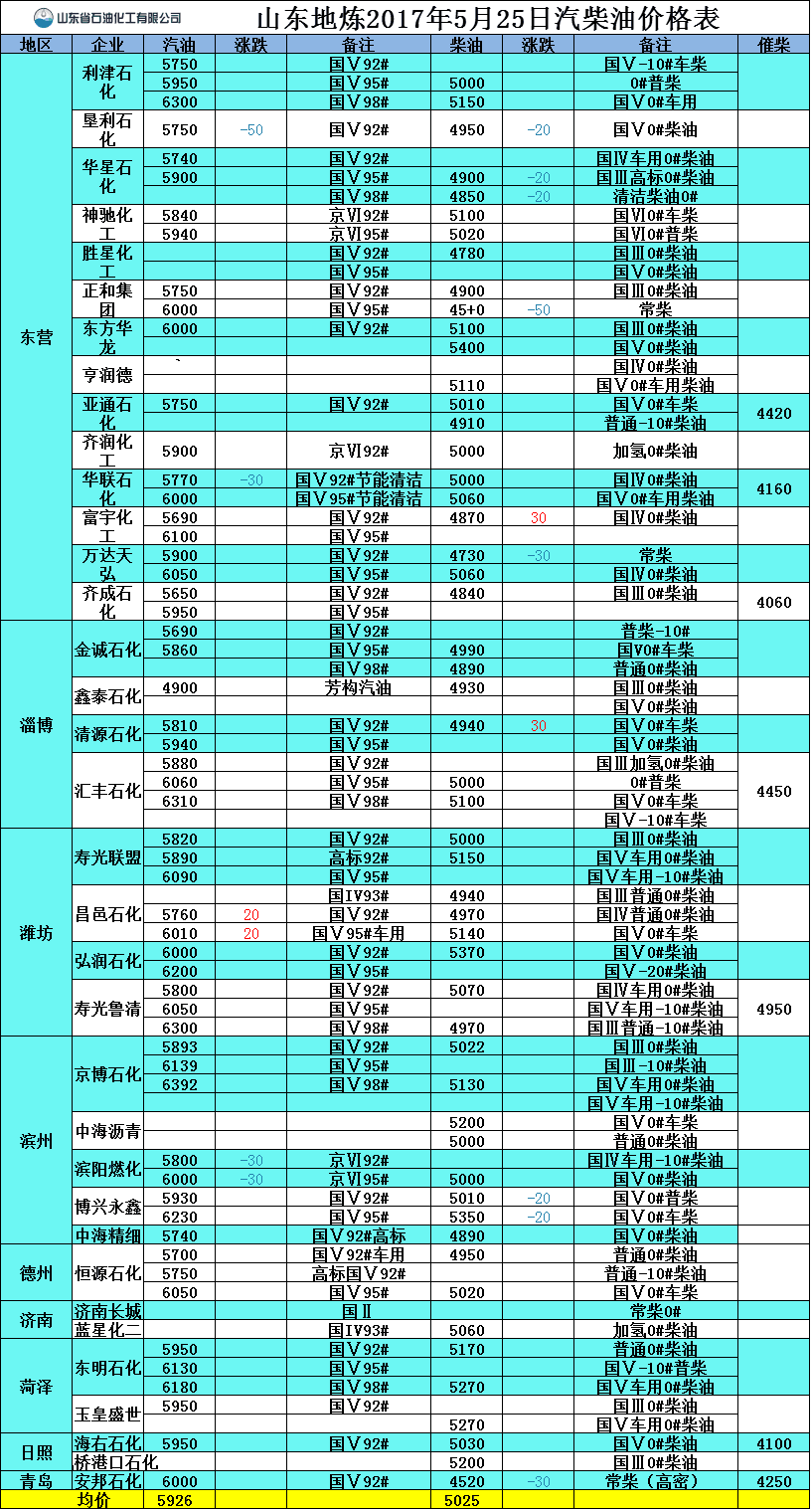 2017年5月25日山東地煉汽柴油價格
