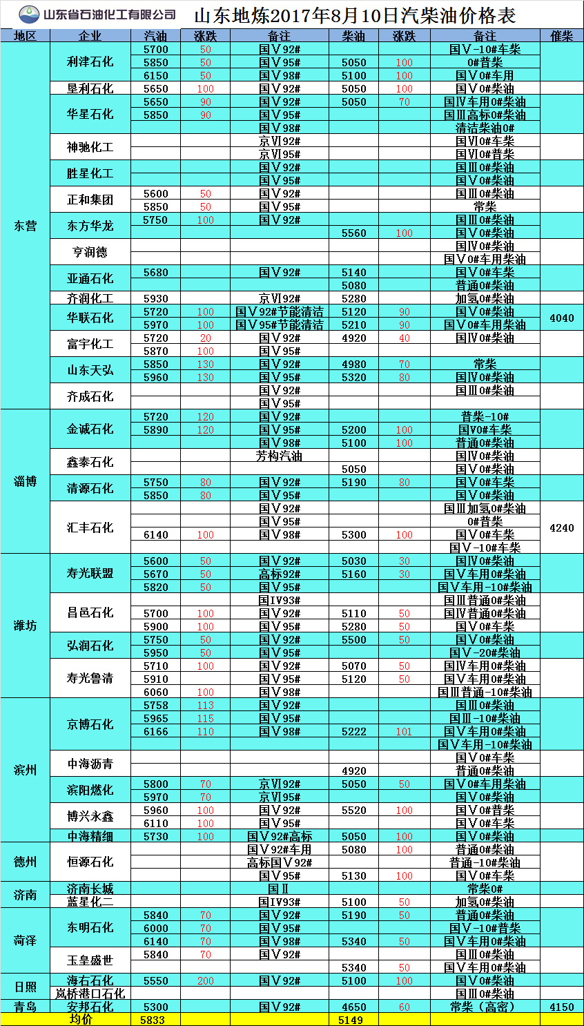 山東地?zé)?017年8月10日汽柴油價格表